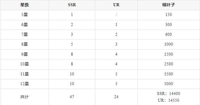 一般我们只使用SSR级和UR级宝可梦,我整理了下这2个品质的宝可梦升星所需的宝可梦数量以及银叶子数量: